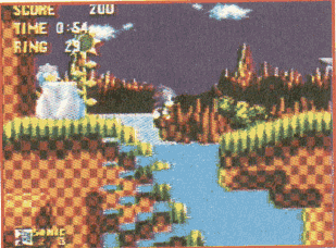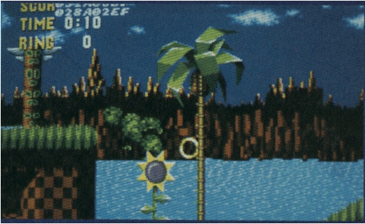 An unknown city is viewable in the background of Green hill zone. Possibly a mockup screeshot. Trees and a brown rock are viewable in the forground. The rock viewable is bluish purple in the final game.