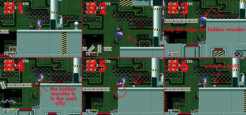 SUNYATE, a member of the CulT forums found this years ago when he first got Sonic The Hedgehog. Appearently, all through Scrap Brain Zone Act 2 there are various powerup boxes with no useful purpose. That, and they're in really fucking odd spots. Quote SUNYATE: " the first day sonic the frikkkin hedgehog came out, i devoured the game, and noticed a strange curiosity within the scrap brain. for years, i've asked people to tell me what it is, and nobody knew, or just ignored me. several years ago, i downloaded genecyst in hopes i could see this clearly and maybe find out what it is via layers, but NOOOOOOFUCKINGOOOO, my effing computer wouldn't have it and i never was able to get genecyst to work without crashing windows. so, with that said, this may seem like the dumbest question in the world, but i'll ask anyway. peek at this pic, nevermind the visible monitor. there's a hidden monitor in the wall. once hit, something pink pops its head thru the chrome. a flower? i was never able to recognize the sprite.." So the search began. The box above is at 072F018C (for those who are unaware of what that means, it means the top row of numbers that appear where the score is located when the debug mode is active)