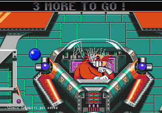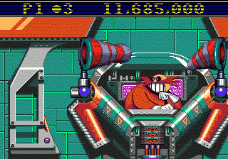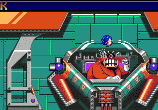 Boss: Dr. Robotnik As I said before, Dr. Robotnik is ridiculously large and getting away. This Boss isn't really hard, just annoying as hell. First off, you have to hit a switch at the bottom of cockpit to switch Dr. Robotnik's defenses. He has two defenses: one is a giant robotic arm that will grab you and drop you out of the room; another one is a sock, yes a sock. Dr. Robotnik will catch you in a sock and throw you toward a window (it takes three hits to fall though the window though - but due to the buggy programming, if you keep a direction pressed, you can score all 3 hits on one go). Keep hitting the bottom button until there are no defenses, then fire yourself up to hit the top of the glass cockpit (keep holding DOWN on the dpad so you actually hit Robotnik instead of just looping through the passage). Eventually, after about 12 hits, Dr. Robotnik will be defeated. Good luck.