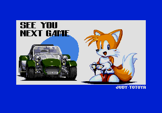 Tails?? This was hidden, but I believe he was supposed to be found. I think it was supposed to entice you into buying Sonic 2. Unfortunately, Sonic 2 came out before Sonic CD. The dune buggy is most likely a reference to Sonic Drift, in which tails drives a buggy that is basically identical to this one. |