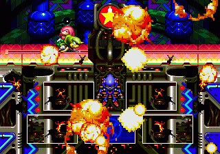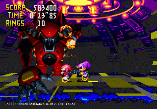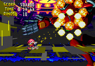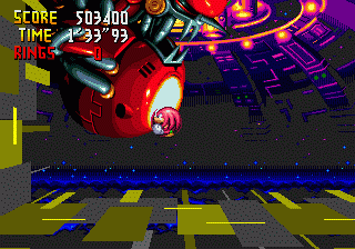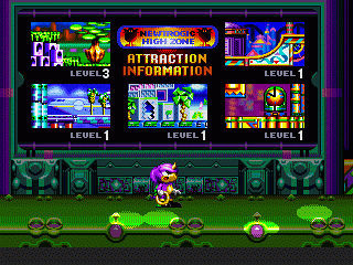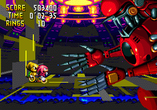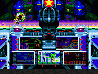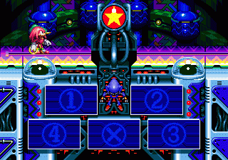 Not exactly a complete stage, the World Entrance serves as a simple place to select your partner and stage of play. Through the Combi-catcher, a surreal UFO Catcher type of device, one can change their partner to any of the starting characters, plus the additional useless 'bots; Bomb and Heavy. After this, it's on to the world select, a warped version of the roulette system, where by hitting the bumper, you'll stop the light on a certain stage, and off you go. Both processes can be made easier by collecting various items within the free-fall special stages. The time of day also changes between dawn, daytime, sunset, and night each time you enter. Whichever time of day you have here, will also affect the time of day within a zone upon leaving. Once finished with all five levels of each area, you battle Metal Sonic here. Defeat him to move on to his much larger version, and the end of the game.