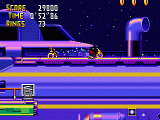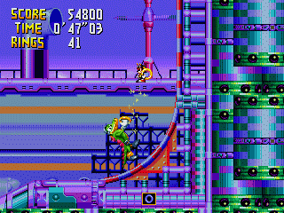 This relaxing harbour stage has you navigating your way through various obstacles with the help of some nice ships. Hitting the switches atop the vessels will cause the boat to move, giving access to new paths. Pleasant and calming, this stage rather strangely features no underwater air-bubble whoring sections whatsoever. Although, there are plenty of robot nasties in the air to keep you occupied. Dr. Robotnik comes at you with a hexagon shaped polygon armor, which changes form to either protect Dr. Robotnik, or open up for attacking purposes; leaving the wicked Doctor vulnerable to attack.