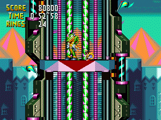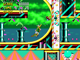 What one would assume to be a giant Roller Coaster track of some kind, is perhaps the fastest stage in the game. You'll find yourself endlessly running up and down steep inclines, and zooming around head-spinning loops. There's many routes to take within this zone, on both the higher and lower planes, although there seems to be lack of enemies along many higher routes, so advantage of the many and ledges elevators to reach them. Upon reaching a Carousel in act 5, the Egg-shaped Doctor blasts the entire ride high into the sky, where it's up to you to attack the vulnerable center area where Robotnik is seated. Just be sure to avoid the spinning spiked-platforms rotating around the arena.
