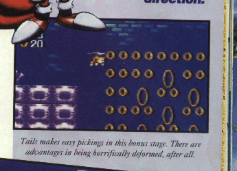 Appearently, this screenshot is all fucked up. First off, Tails can't be in this area, this special stage area doesn't appear in the game. The large rings are different, and there should also be grass on top of the left platform area. |