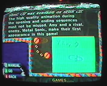 ![]() Presented by Sega ![]() Nice menu system, lazy asses ![]() No hidden games found ![]() There it is! ![]() All games activated ![]() Again ![]() Again ![]() Swish! ![]() Storyline ![]() More ![]() The manual (Eurotrash version) ![]() More Download a video of it here - This shows Sonic CD in the menu, although it links to Sonic 1. (WArning: close to 30MB |