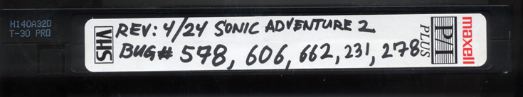 The following is from a tape used by a tester who worked on Sonic Adventure 2. ![]() Tape owned by Grap3fruitman ![]() Tails falling out of a level ![]() Sonic too! Download the tape here! Special thanks to grap3, who was kind enough to share and not bitch. |