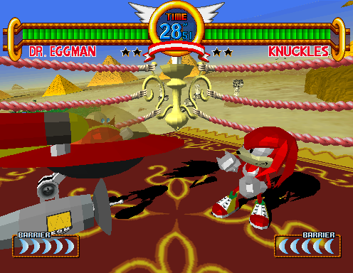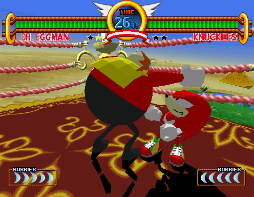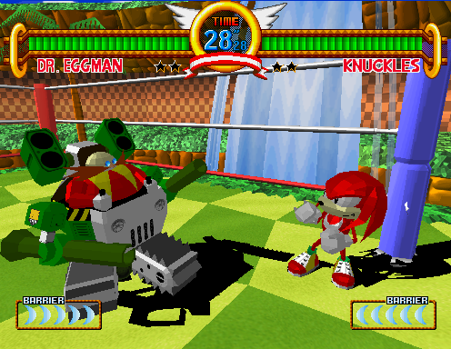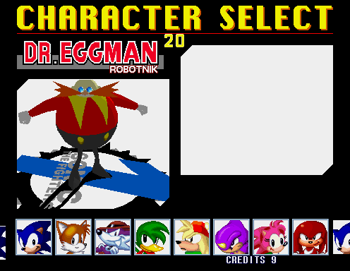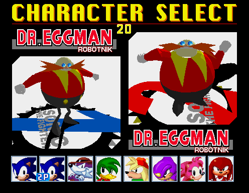 In Sonic the Fighters, Eggman only appears out of his ships and mech units during the intro of the game. However, through hacking, this Eggman can be playable, and has similar moves as the Eggman fought after defeating Metal Sonic and also shares the same title card. The only real difference is his default punch moves, which are similar to Knuckles'. ![]() Eggman as seen in the intro. ![]() Eggman as seen in gameplay. However, can Eggman be playable without hacking? There is a theoretical method. It is based on an unconfirmed cheat code for the arcade version of Fighting Vipers: Fight as B. Mahler: Wait for the timer to reach nine seconds at the character selection screen. Quickly hold Start + Up. While continuing to hold Start repeatedly press Up/Left or Up/Right to move the pointer to the other side of the screen one fighter at a time. For example, if you are player one, move to the right starting on Grace. If you are player two, move to the left starting on Rickey. Keep Start held and point Up between steps. The pointer will eventually go off the screen and the character portrait will change to B. Mahler. Note: This can only be done on machines with over accumulated 15,000 plays. This particular version of the code was found at gamewinners.com. This code has been attempted by brute-forcing the emulator into thinking that the game has been played 15,000+ times, however it did not work. It could be due to the fact that after the 15,000th play, something is triggered and sent into the game's memory. Either case, this code does have some evidence to back it up. In both Fighting Vipers and Sonic the Fighters, an array of bytes is used to determine which characters are selectable and in what order they appear at the character select screen, as shown here: ![]() The array of bytes for Fighting Vipers are: 01 04 06 03 07 00 02 05