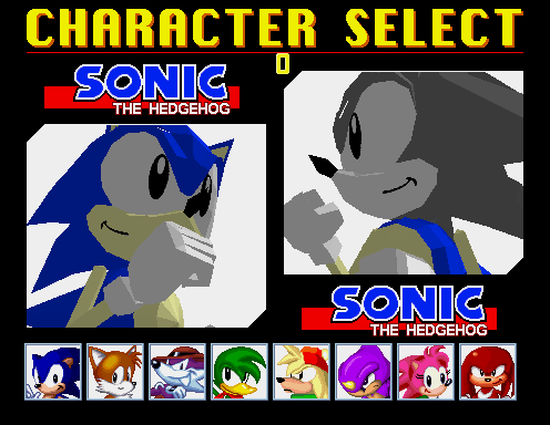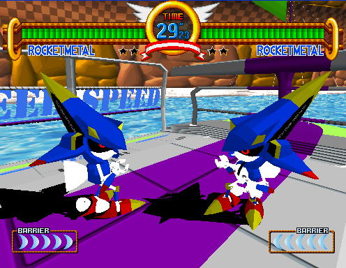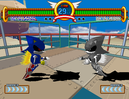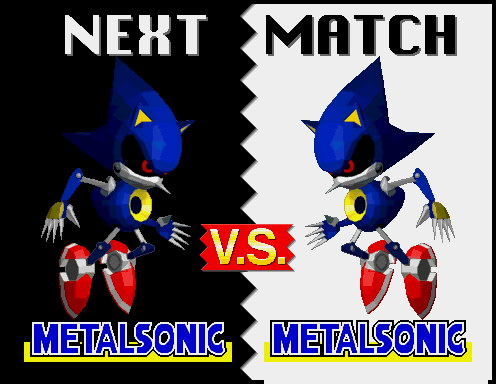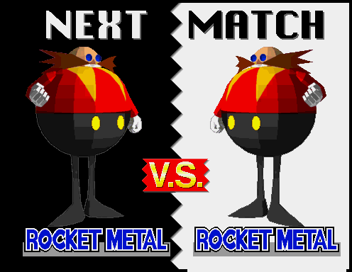 ![]() Metal Sonic at the character select screen. Note that both Player 1 and Player 2 have selected Metal Sonic, but neither of them are grayscale. ![]() Metal Sonic's title card. ![]() Note, this image is actually a mock-up based on data found in the game. Grayscale Metal Sonic data is found in the game in it's entirety, including his exhaust coming out his rocket, however, due to the game over-writing Metal Sonic's body objects so fast, applying the grayscale objects for a screenshot would be impossible. This shot is as accurate as it can get, except for the gray Metal Sonic title. It is currently unknown what handles the name data. :