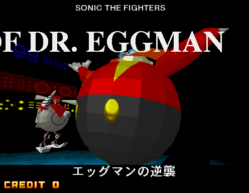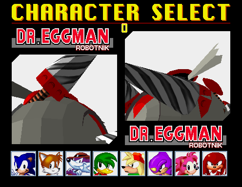 ![]() This is Eggman's Robot. It can be seen in the intro when Eggman sends these things down to Earth to reign chaos and destruction. It's interesting to note that the Eggman Robots that are seen on Eggman's viewing screen in the intro are low-poly renders of this Eggman Robot, most likely to reduce the amount of total polygons in that particular scene so it would execute at a reasonable speed on the arcade hardware. ![]() A better shot of the low resolution version of Eggman's Robot. ![]() Eggman's Robot at the character select screen. Because this character was never interned to be playable, it does not have any grayscale version of itself within the game data. ![]() Even during gameplay, Eggman's Robot rotates it's head every six seconds. This is because of how the mechanics of the intro to the game work. The introduction scene at the beginning of the game is just a series of arenas and objects in them. During the part showing Eggman and the Eggman's Robot, Eggman is Player 1 and Eggman's Robot is player 2. Basically, the intro is automated gameplay with different camera angles. And since the Eggman's Robot character is programmed to rotate its head every six seconds, he will do it regardless if it is in a cutscene or not. ![]() Eggman's Robot has the exact same moveset as the final Eggman boss. The only difference is in the triple punch move, where the speed lines are purple instead of white. This is probably because a different pallet is loaded for this character. ![]() Eggman Boss's move for comparison. OE - DUM6: