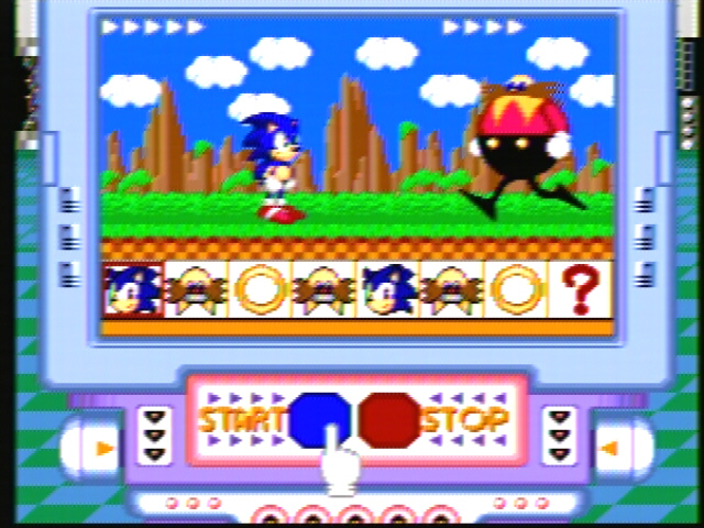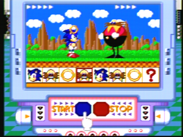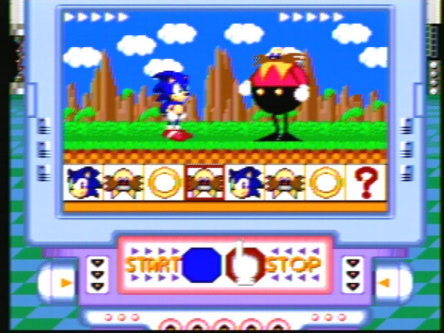 Description: A battle to the death between Sonic and Robotnik... Their weapons... RINGS. This one's all about chance. There are 8 spaces on the roulette: 2 Sonics, 3 Robotniks, 2 Rings, and 1 Mystery. The Sonic makes Sonic attack, and the Robotnik makes Robotnik attack. The Ring heals SOnic of 1 damage. The Mystery provides for a random result. Survivor wins. Odds of victory are slightly in Sonic's favor.