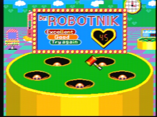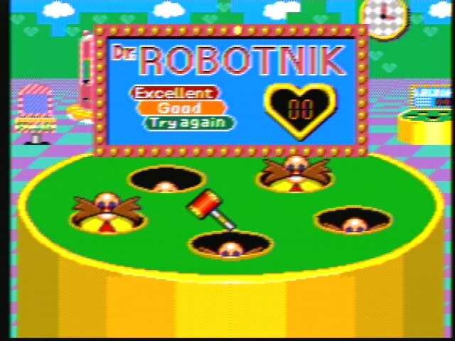 Description: It's Whack-A-Mole, Robotnik-style. Hit as many Robotniks as you can in 50 seconds. Unfortunately, when you hit a Robotnik, you get the worst sound effect in the history of video games. It's SUPPOSED to be Robotnik saying something like "Whoops, heh heh." Too bad it sounds nothing like even the Robotnik voice for this game. In fact, remember your fat, old, English teacher from elementary school? That's the voice.