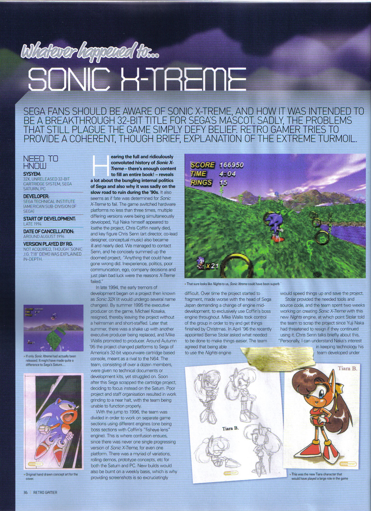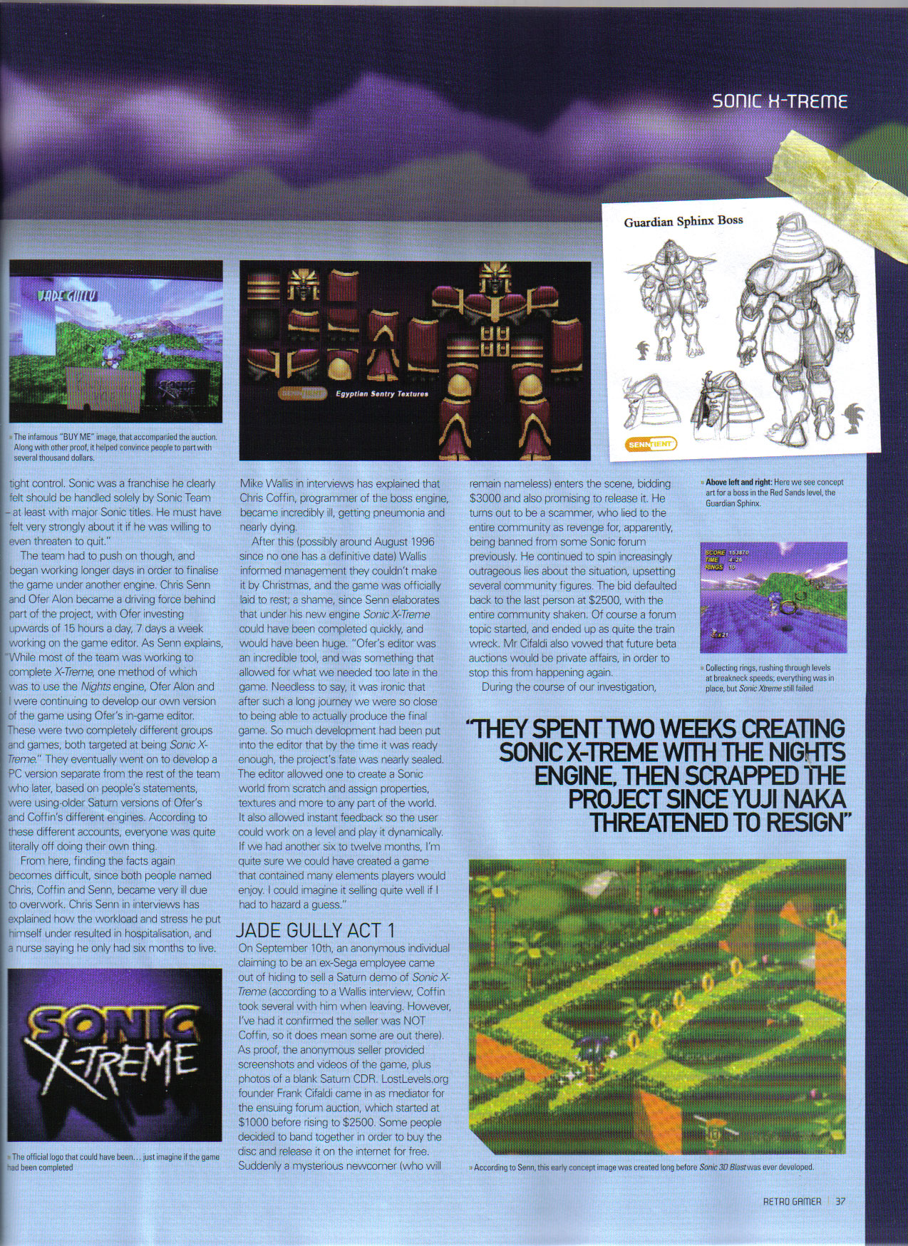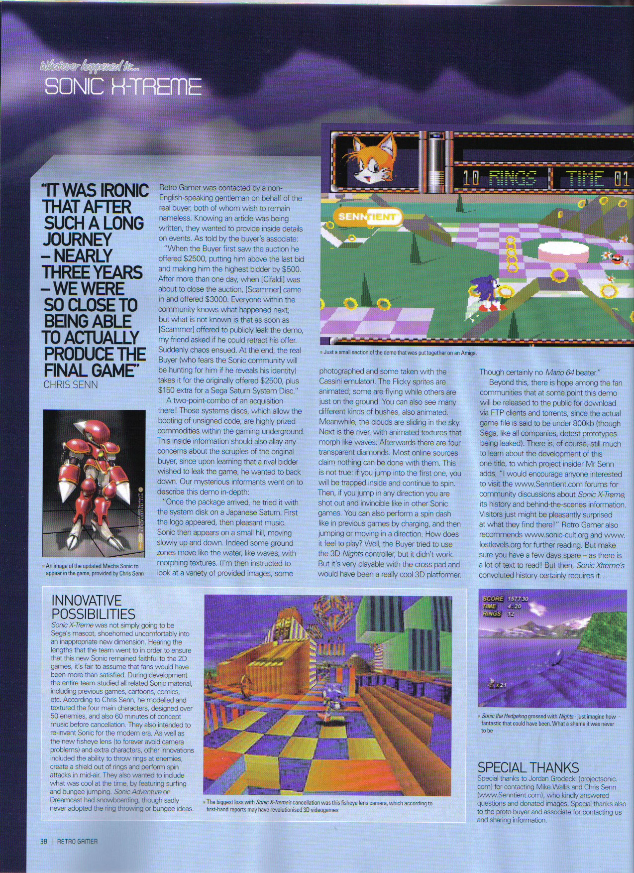 At the very least there are 2 prototypes of Xtreme to exist. One of them was auctioned for two thousand and five hundred dollars, and bought for the sole reason so none of you can get a copy (as the community also raised this sum of money, it went to a private buyer instead because he will not rip it). Well, least we got some pix of it. Judging from those, former devs like Chris Senn and Mike Wallis told us that this wasn't even the real game Sonic Xtreme, but some hurried and messed up demo disc. That's 2500 bucks well spent folks. What it does look like is Chris Coffins boss engine supposedly used for the Metal Sonic boss stages. But other then the HUD, it doesn't look that similar (not enough pictures from the Metal Sonic boss level to judge), so for all we know this disc may be using the NiGHTS engine. Without looking into the game file we cannot know for sure. So, knowing that you will never get to play this, disassemble this, nor learn more of this, here are some pretty pictures.