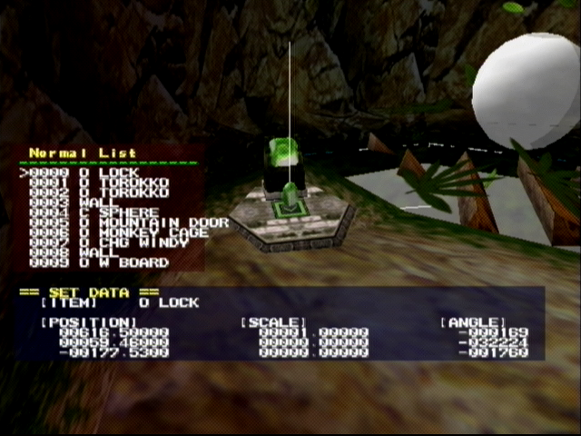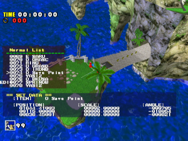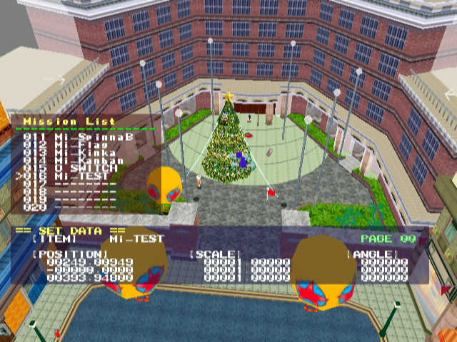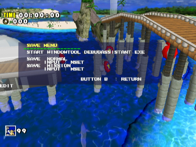 The first mode features the mission editor. It's very basic, each mission has its own list of objects that trigger certain events. The Christmas tree is referred to as "Mi_TEST" You can also add and change different mission-related items. Press right on the D-Pad to reveal.. ![]() ![]() Layout editor. This will allow you to browse through and edit all the items in a stage. Modify their location, ID's, size, you name it. Now, when you press the start button... ![]() To bring up the save menu. Unfortunately, we cannot do much with this, because we don't have the DebugAssistant.exe program. We can only guess what it does based on the following text strings in the game: DebugAssistant: Connected to USB DA_ASSERT failed on the expression: <%s> %son line %d of file "%s" %sDescription: DA_AppendFileToPC: path and filename required. debug_assist.c Ping received. help Help Menu - Registered Commands: %s We can probably safely assume that the DebugAssistant tool takes the modified stage layout and creates Set bin files for them. SET files contain the stage layouts for each map, so this is a particularly useful utlity for creating layouts, however, without access to this file we can only guess what its full functionality is. |