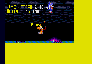 This thing seems to tweak out when you pause it. It shrinks the amount of the screen and replaces it a yellow bar. You can also move your sonic around the screen. What's funny is, when you do it, their arms come off.