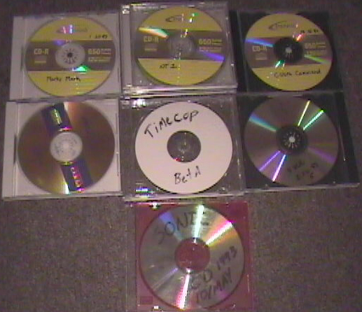Prerelease cds. From top left: Marky Mark, Night Trap (original), Cobra Command, Sonic CD beta (712, original sega copy), Timecop (copy), Virtual VCR, Sonic CD beta (512, copy)